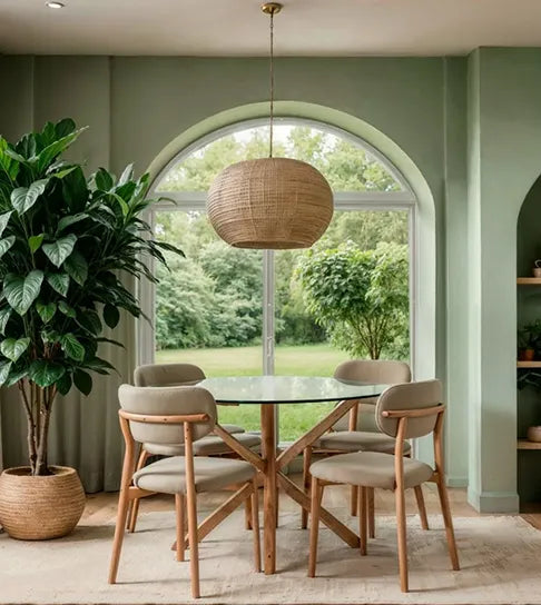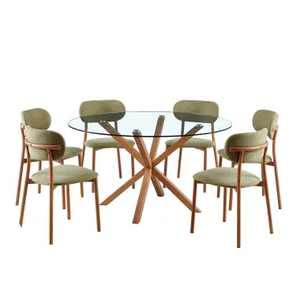 Su forma redonda reúne y suaviza el ambiente. La cubierta de vidrio permite que la luz fluya con naturalidad, mientras las sillas curvas envuelven cada momento con comodidad y calidez. Una pieza que armoniza el espacio y transforma cada encuentro en una experiencia cercana y sin prisa.