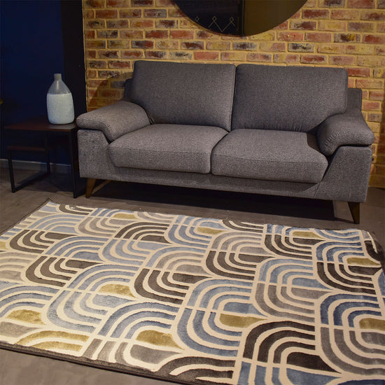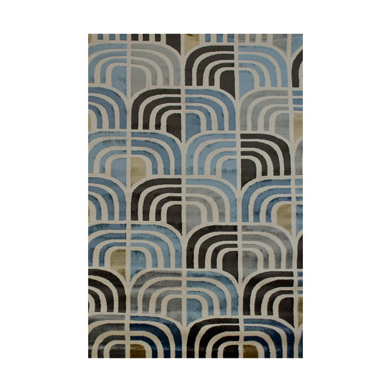 Renueva tu hogar con nuestra alfombra de diseño geométrico en tonos de azul, gris y beige. Esta pieza presenta un patrón repetitivo de arcos concéntricos que se asemejan a escalas u olas, creando un efecto visual armonioso y moderno. La combinación de colores neutros y el diseño rítmico hacen que esta alfombra sea perfecta para complementar cualquier estilo de decoración.