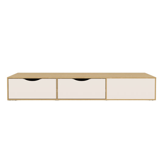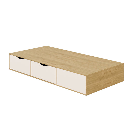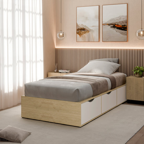 Base Cama0.90 Compac Natural, Off White ofrece funcionalidad y estilo en un diseño compacto. Su estructura en acabado natural y frentes en off white aportan un toque moderno y cálido. Incorpora cuatro amplios cajones inferiores, ideales para optimizar el espacio de almacenamiento. Perfecta para habitaciones juveniles o espacios reducidos.
