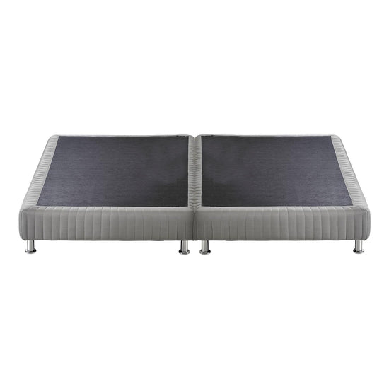 La Base Cama King Energy Gris Par está conformada por una estructura de madera compuesta por dos piezas, revestida con tela Jackard en tono Gris. Las patas son de acero cromado, lo que aporta resistencia y durabilidad.