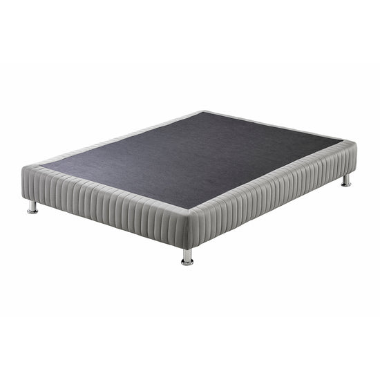 La Base Cama Sencillo 1.00 Energy Gris presenta una estructura de madera revestida con tela Jackard en tono Gris, complementada con patas de acero cromado.