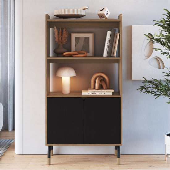 Biblioteca Alta elaborada en madera industrializada de pino MDF y acabado BP que garantiza su durabilidad y resistencia. esta biblioteca combina resistencia y estilo. Sus patas redondas de acero carbono y zapatas regulables garantizan estabilidad en cualquier superficie. Equipada con estantes y dos puertas con bisagras amortiguadas, ofrece un acceso fácil y silencioso a sus contenidos. ¡Sumérgete en el mundo de lectura y organizacion con nosotros! Transporte y armado gratis