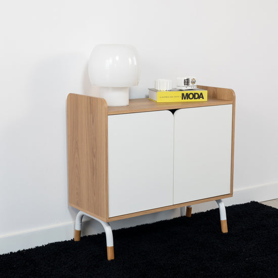 Biblioteca baja elaborada en madera industrializada de pino MDF y acabado BP que garantiza su durabilidad y resistencia. esta biblioteca combina resistencia y estilo. Sus patas redondas de acero carbono y zapatas regulables garantizan estabilidad en cualquier superficie. Equipada con dos puertas con bisagras amortiguadas, ofrece un acceso fácil y silencioso a sus contenidos. ¡Sumérgete en el mundo de organizacion con nosotros! Transporte y armado gratis