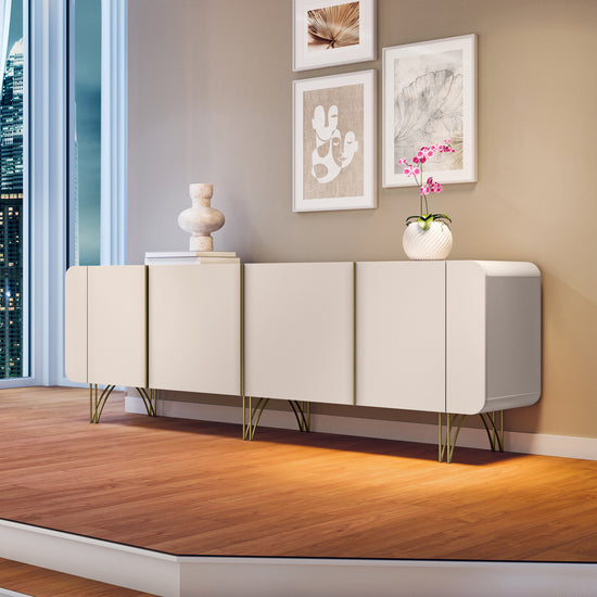 Bife elaborado en tablero de MDF/MDP de pino con pintura UV color Off White, contiene 4 puertas abatibles y 4 cajones, cuenta con espacios amplios ideales para guardar objetos de tu preferencia