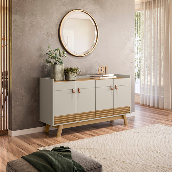 Con 4 puertas abatibles con manijas en cuero y espacios amplios ideales para guardar objetos de tu preferencia, el Bife elaborado en tablero de MDF/MDP de pino con pintura UV color Natural, Off White, es ideal para realzar la belleza de tu hogar. Transporte y armado gratis.