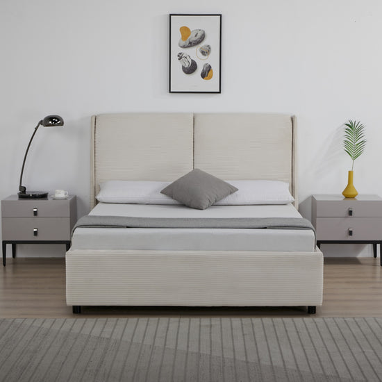 La Cama Doble Arlette Beige realza tu habitación con su elegante tapizado texturizado y diseño envolvente. Su cabecera acolchada y tonos suaves crean un ambiente acogedor, perfecto para quienes buscan confort con estilo contemporáneo.