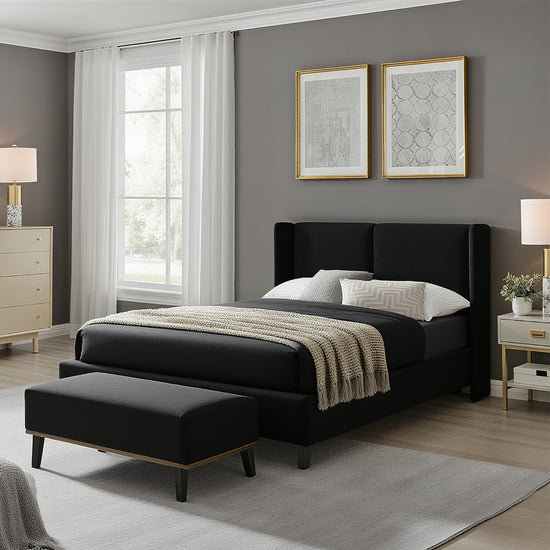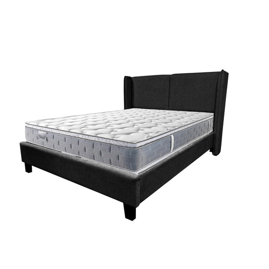 La Cama Doble Barcelona Gris Plomo impresiona por su cabecera alta dividida en dos paneles y laterales ligeramente curvos. Su diseño elegante y estructura visualmente liviana la convierten en una opción moderna y acogedora para el dormitorio.