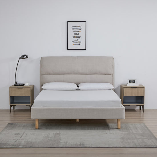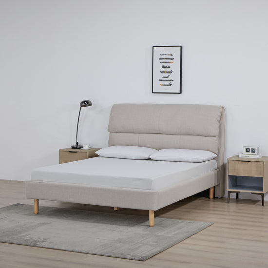 La Cama Doble Cameron Crudo se destaca por su diseño moderno y cabecera con acolchado en dos niveles que aporta presencia visual. Su tonalidad clara y estructura estilizada con patas negras la hacen ideal para espacios contemporáneos.