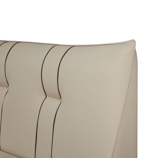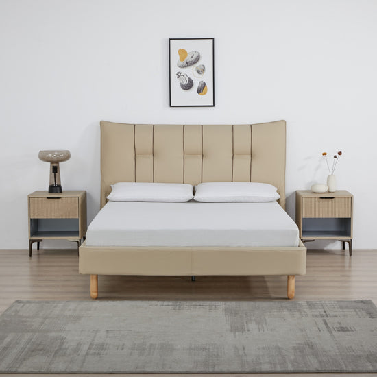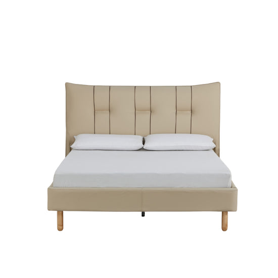 La Cama Doble Kenzo Beige destaca por su respaldo alto con franjas acolchadas y diseño envolvente. Su tapizado en eurocuero es fácil de limpiar y resistente a líquidos, ideal para quienes buscan elegancia y practicidad en un solo mueble.