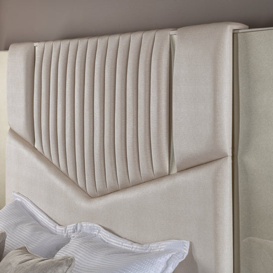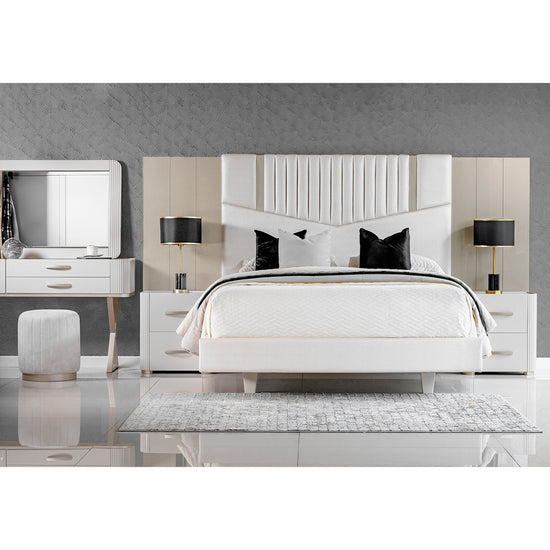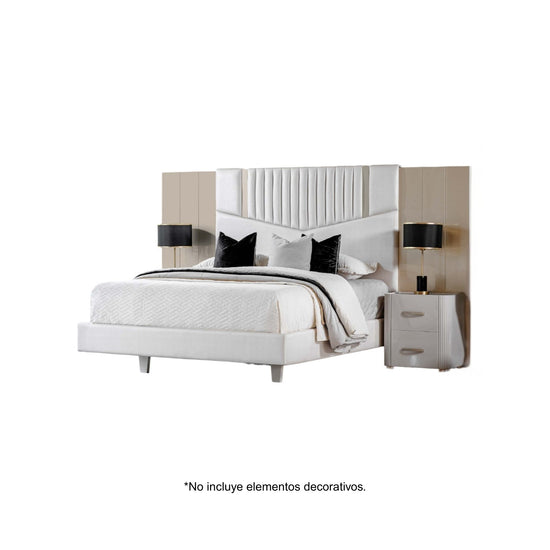 Un toque de distinción en tu dormitorio. La cama Sabina combina un diseño elegante con un cabecero imponente que se convierte en el protagonista del espacio. Está tapizada en tela Eurolino resistente y de fácil limpieza y desinfección. Su acabado en pintura poliuretano garantiza durabilidad y un brillo sutil que eleva el estilo del ambiente.