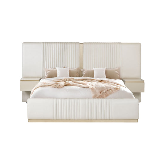 La cama Celestia fusiona lujo contemporáneo y diseño sofisticado. Su cabecera extendida con acolchado volumétrico envuelve el espacio, creando un ambiente elegante y acogedor. Una sutil incrustación de madera al centro añade contraste y distinción. Incorpora nocheros flotantes integrados, que combinan funcionalidad con una estética minimalista, ideal para espacios modernos o contemporáneos.