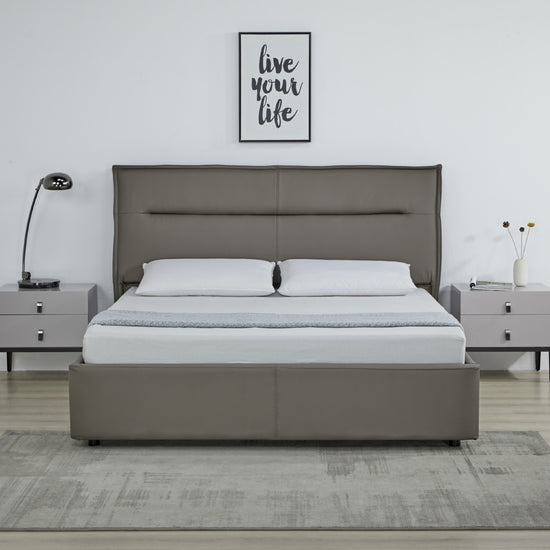 La Cama King Luka Plomo combina elegancia contemporánea con practicidad. Su respaldo ancho aporta fuerza visual, mientras el eurocuero garantiza durabilidad, fácil limpieza y protección contra líquidos. Ideal para grandes espacios con estilo.