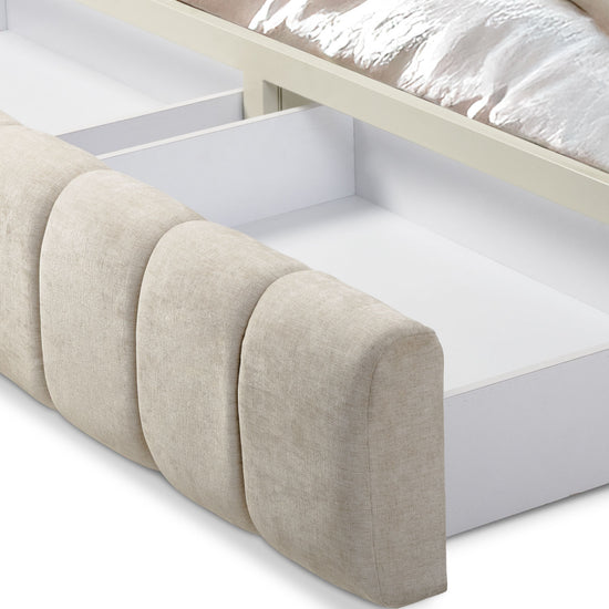 La Cama King Oklam en color Almendra se convierte en el centro de atención del dormitorio con su imponente diseño y acabados de alta calidad. Su cabecero y piecero con capitoné de gran escala evocan sofisticación, mientras que su estructura robusta asegura el máximo confort. El color Almendra aporta calidez y versatilidad, ideal para crear un ambiente acogedor y elegante. Además, incorpora gavetas ocultas en el piecero para un almacenamiento extra sin afectar su diseño refinado.