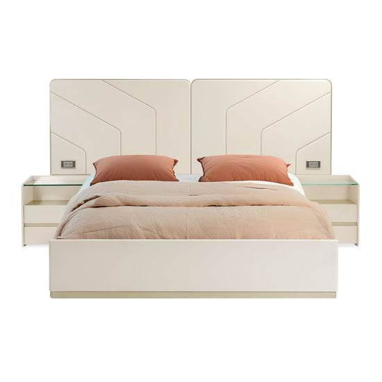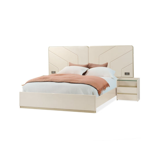 Esta cama destaca por su diseño vanguardista y funcionalidad, con un cabecero amplio de líneas geométricas que aportan un toque moderno y elegante. El color claro de la estructura no solo añade luminosidad a la habitación, sino que también combina fácilmente con diversos estilos decorativos. Entre los detalles funcionales se incluye prácticos conectores de energía integrado en cada lado del cabecero, ideal para cargar dispositivos electrónicos sin complicaciones.