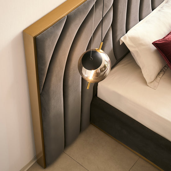 La Cama King Sharon en velvet gris oscuro combina diseño contemporáneo y textura aterciopelada suave al tacto, creando un ambiente elegante y acogedor. Su cabecero acolchado es el detalle perfecto para un dormitorio lleno de estilo y confort.