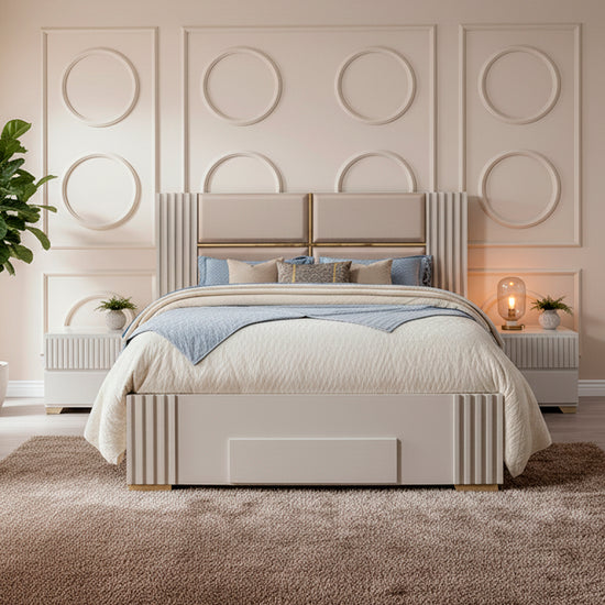 La cama King Texas combina elegancia y practicidad en un diseño contemporáneo. Tapizada en exclusiva tela Eurolino de fácil limpieza, su cabecera con detalles geométricos y laterales acanalados aportan un estilo sofisticado al dormitorio. Cuenta con un práctico cajón frontal en el piecero para almacenamiento adicional, ideal para optimizar el espacio sin perder estilo.