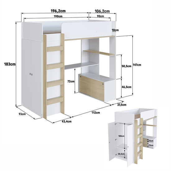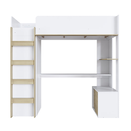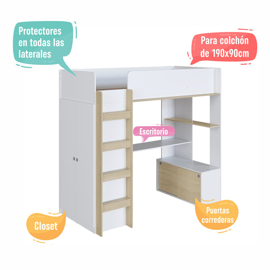 Con un diseño elevado tipo loft, la cama multifuncional Axel combina zona de descanso, almacenamiento, y área de estudio en una sola estructura funcional, moderna y compacta. Su estructura integra una cama superior de una plaza con escalera lateral, un escritorio integrado, estanterías abiertas para libros o decoración, y un clóset con puertas para guardar ropa u objetos personales. Además, su módulo inferior cuenta con un práctico gabinete con puertas corredizas que amplía aún más el espacio de almacenamiento.