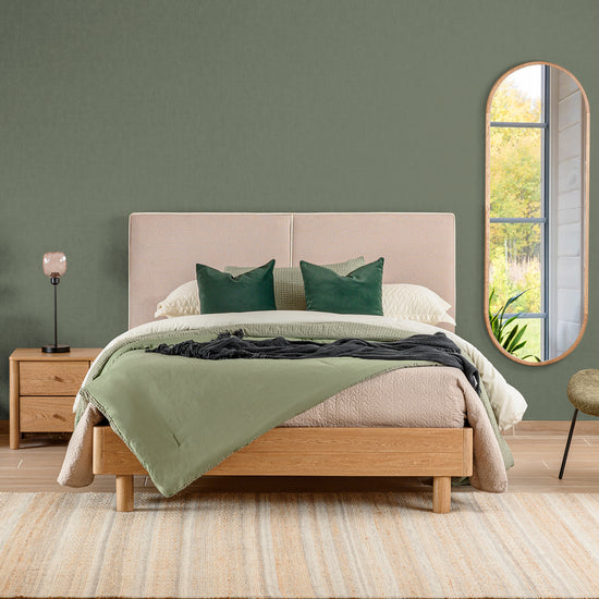 Cama Danes con diseño moderno, tapizada en una suave tela al tacto, su cabecero acolchado invita al descanso mientras aporta un toque de elegancia al dormitorio. El diseño de la estructura, en acabado de madera natural, resalta las vetas visibles que aportan calidez y un carácter orgánico al ambiente.