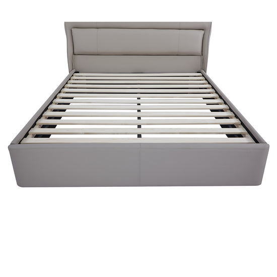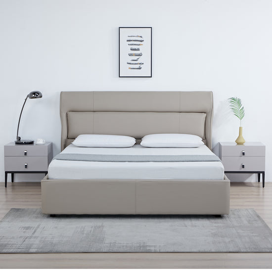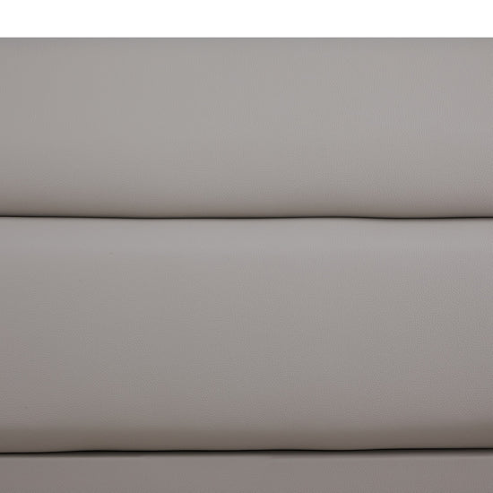 La Cama Queen Ghala Beige destaca por su estética refinada y su funcional tapizado en eurocuero, que ofrece resistencia a líquidos y limpieza sencilla. Su cabecera con franjas horizontales realza cualquier espacio moderno.
