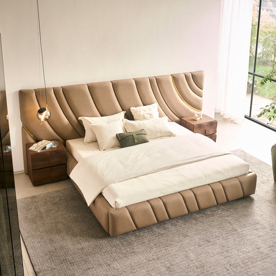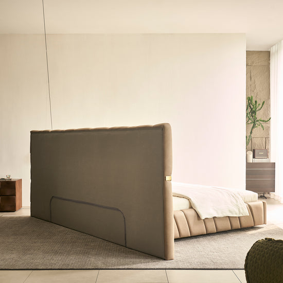 Sumérgete en el lujo contemporáneo con la Cama Queen Luna en microfibra color taupe. Su diseño elegante y sofisticado con un cabecero alto y acolchado en líneas verticales brinda un ambiente cálido y envolvente. Perfecta para dormitorios modernos que buscan un toque de distinción y comodidad excepcional cada noche.