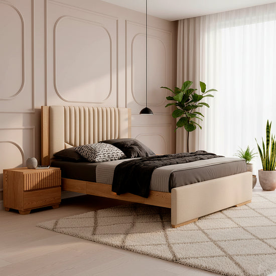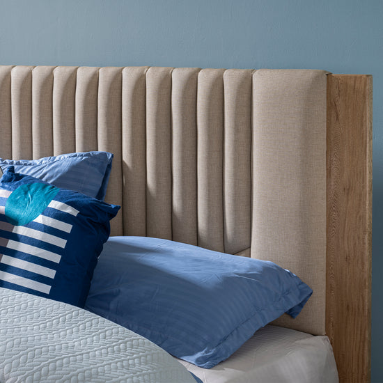 Este diseño aporta juventud y frescura a tu habitación, posee una perfecta combinación entre la madera de su estructura de Roble y su cómodo tapizado alistonado con tecnología Eurolino de fácil limpieza es decir repele líquidos.