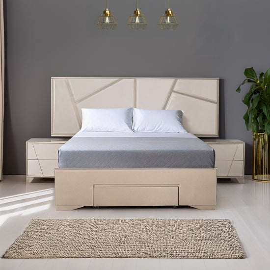 La Cama Queen Munich Champaña, Taupe combina elegancia y practicidad en un diseño contemporáneo. Su cabecero extendido bitono con relieves geométricos crea un punto focal sofisticado, mientras la gaveta en el piecero añade funcionalidad con espacio de almacenamiento. Fabricada en madera de roble y con acabado en pintura poliuretano, es ideal para dormitorios modernos y acogedores.