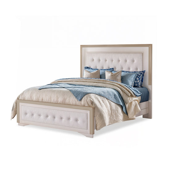 La Cama Queen Romantic destaca por su diseño clásico con toques glam. Tapizada en Eurolino de alta resistencia, su cabecero y piecero presentan un elegante diseño capitoneado que aporta textura y sofisticación. Los marcos en acabado champaña realzan su estética atemporal. Perfecta para dormitorios acogedores que buscan funcionalidad y estilo refinado.