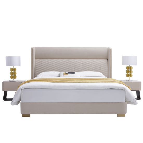 La Cama Queen Vivaldi Beige combina diseño elegante con detalles modernos. Su cabecera curva con panel central en relieve aporta distinción, mientras las patas metálicas doradas elevan visualmente la estructura para un acabado refinado.
