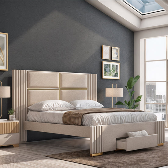 La cama Texas semi doble combina elegancia y practicidad en un diseño contemporáneo. Tapizada en exclusiva tela Eurolino de fácil limpieza, su cabecera con detalles geométricos y laterales acanalados aportan un estilo sofisticado al dormitorio. Cuenta con un práctico cajón frontal en el piecero para almacenamiento adicional, ideal para optimizar el espacio sin perder estilo.