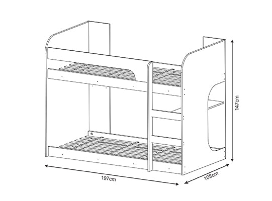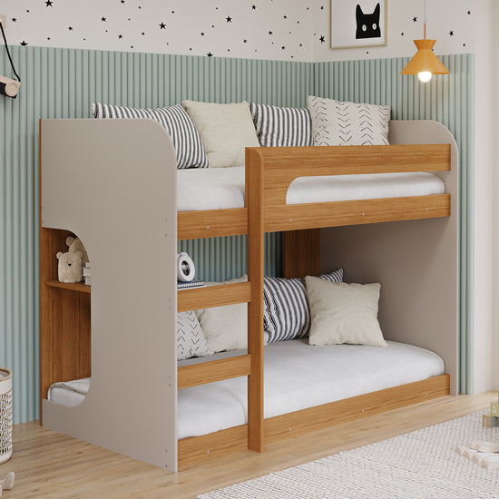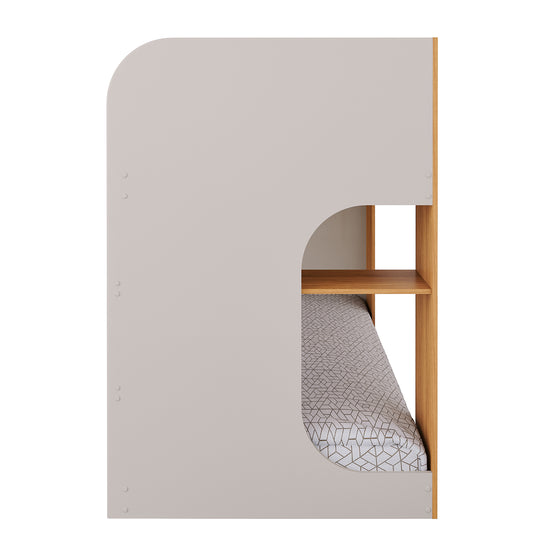 Un camarote estilo Montessori que promueve la autonomía, la seguridad y el desarrollo independiente de los niños. De baja altura para permitir que los pequeños suban y bajen por sí mismos. Su diseño es funcional, seguro y minimalista, con bordes redondeados y escalera accesible. Incluye una repisa de almacenamiento en la cama inferior para mayor organización.