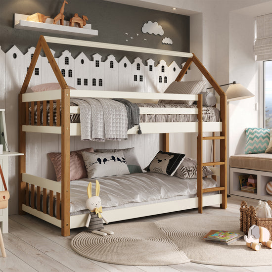 El Camarote Eureka es la combinación perfecta de diseño lúdico, seguridad y funcionalidad para habitaciones infantiles o juveniles. Inspirado en la forma de una casita, su estructura en madera natural con detalles en color off white crea un ambiente acogedor y encantador que estimula la imaginación. Cuenta con barandas de seguridad en la cama superior y una escalera frontal integrada que facilita el acceso.