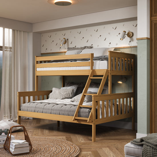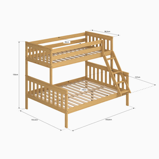 ¡Optimiza el espacio con estilo con nuestro camarote Mixto Oxford Natural Esta litera sencilla mixta, fabricada con materiales certificados, presenta una estructura de 100% madera de roble con un elegante acabado mate. Incluye una cama superior sencilla y una cama inferior doble y barandas para mayor versatilidad y seguridad mientras que la escalera de madera facilita el acceso a la cama superior.