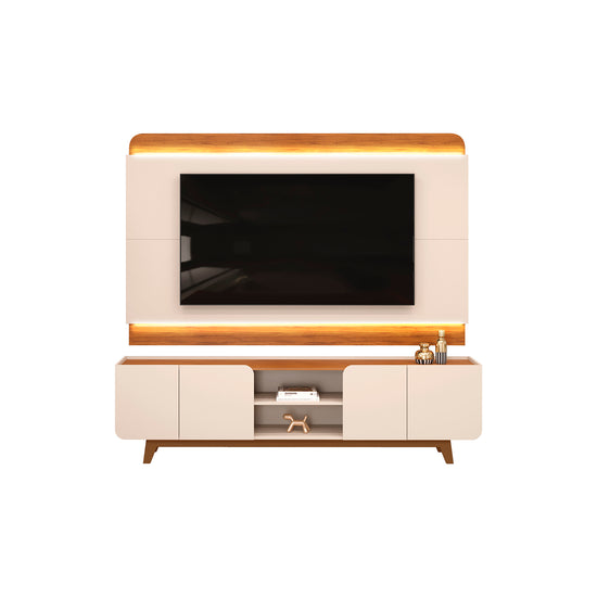 Centro de Entretenimiento elaborado en madera industrializada de pino (MDF/MDP), con una pintura UV que garantiza su durabilidad y resistencia. Su diseño añade un toque contemporáneo y atractivo, convirtiéndolo en un punto central destacado en tu sala de estar. Cuenta con 4 puertas con esquinas curvas, repisa y dos nichos centrales. Con capacidad para televisores de hasta 75 pulgadas, incluye un soporte para TV que asegura una instalación segura y estable. Además, cuenta con luz LED para crear un ambiente acogedor y moderno. Transporte y armado gratis.