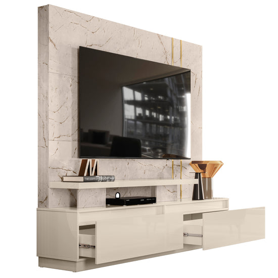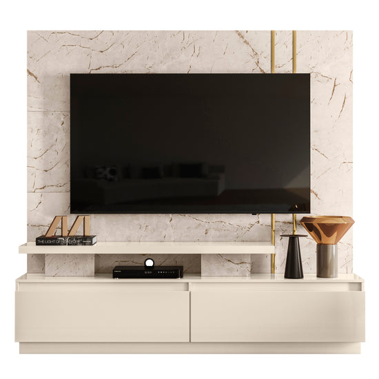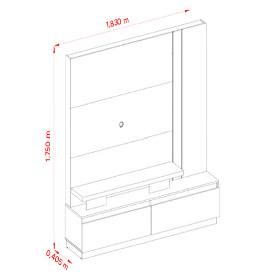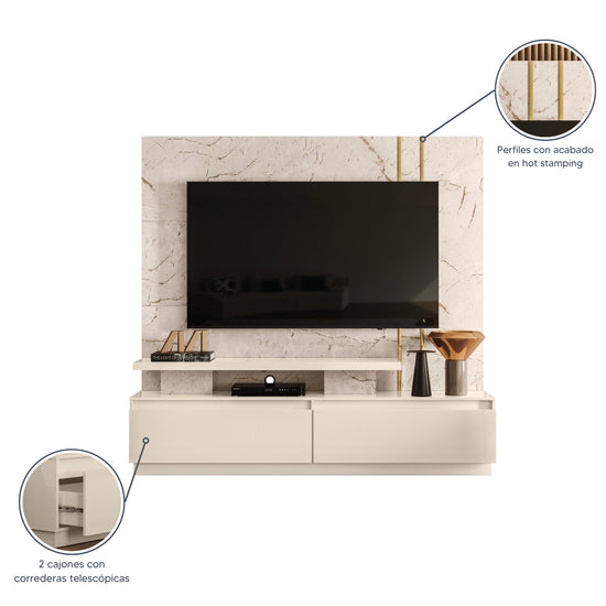 El Centro de Entretenimiento Manhattan está fabricado en madera industrializada de pino, con detalles en hot stamping. Incluye dos cajones con correderas telescópicas, una repisa y un espacio para TV de hasta 75". Su diseño moderno y elegante, con acabados en mármol y soporte de TV, combina funcionalidad y estilo, ideal para tu hogar.