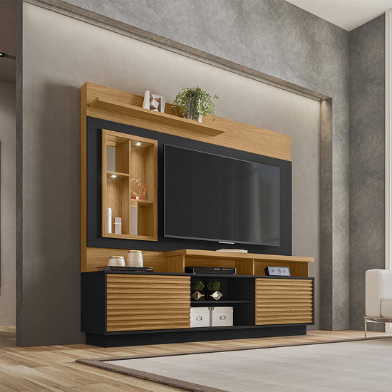 El Centro de Entretenimiento Marcus Natural, Negro combina estilo moderno y funcionalidad. Ideal para televisores de hasta 65", cuenta con dos puertas corredizas, cuatro nichos, dos espejos decorativos y una repisa removible para personalizar el espacio. Su contraste en tonos madera y negro aporta elegancia y carácter a tu sala.