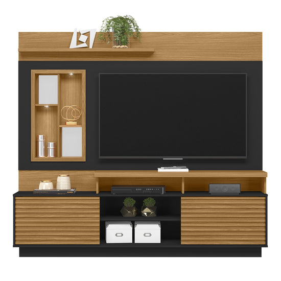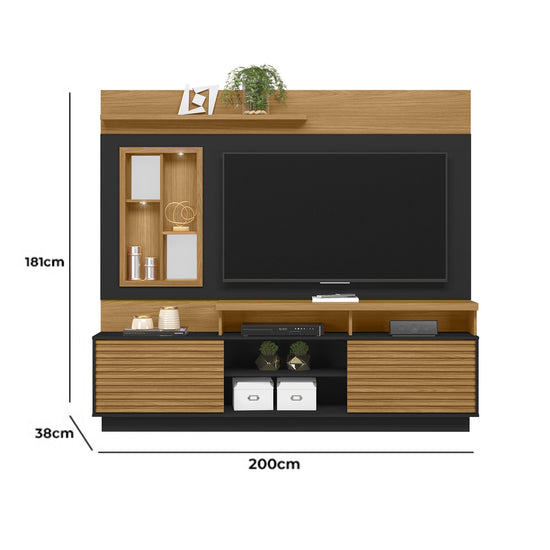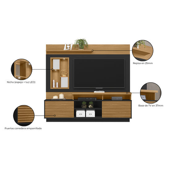 El Centro de Entretenimiento Marcus Natural, Negro combina estilo moderno y funcionalidad. Ideal para televisores de hasta 65", cuenta con dos puertas corredizas, cuatro nichos, dos espejos decorativos y una repisa removible para personalizar el espacio. Su contraste en tonos madera y negro aporta elegancia y carácter a tu sala.