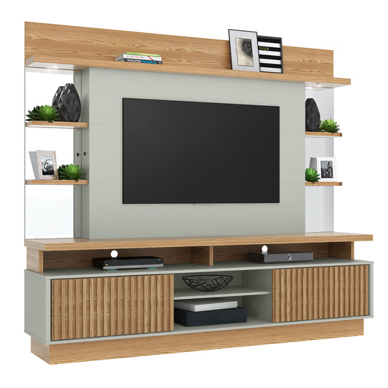 El Centro de Entretenimiento Salvador Natural, Beige 218X193X45, confeccionado en Madera Industrializada de Pino y recubierto con Pintura UV en tonos Naturales y Beige, ofrece una solución completa y elegante para tu sala de estar. Su diseño ha sido meticulosamente pensado para proporcionar funcionalidad y estilo en un solo mueble. Con un soporte integrado para TV, capaz de alojar televisores de hasta 60 pulgadas, este centro te brinda la conveniencia de tener todos tus dispositivos de entretenimiento centralizados, sin sacrificar la estética ni la organización. Además, incorpora una luz tipo LED que crea un ambiente acogedor y realza los elementos decorativos de tu sala. Las dos puertas corredizas garantizan un acceso fácil a tus dispositivos y accesorios, al mismo tiempo que mantienen el espacio ordenado y sin desorden. Como toque final, un espejo decorativo añade una sensación de amplitud y luminosidad a tus espacios, complementando así el diseño funcional y estético de este versátil centro de entretenimiento.