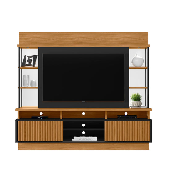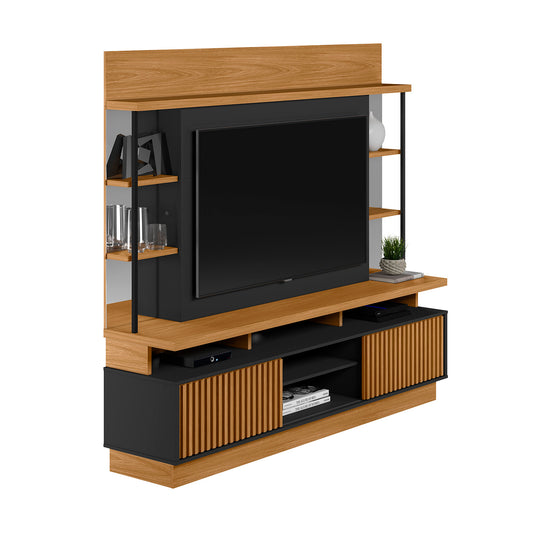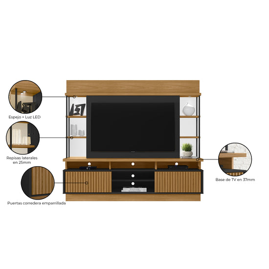 El Centro de Entretenimiento Salvador Natural, Negro es una opción moderna y funcional para tu sala. Con espacio para televisores de hasta 60”, cuenta con dos puertas corredizas que ocultan el almacenamiento, repisas laterales decorativas, espejos y acabados que combinan madera natural y negro para un estilo contemporáneo y elegante.