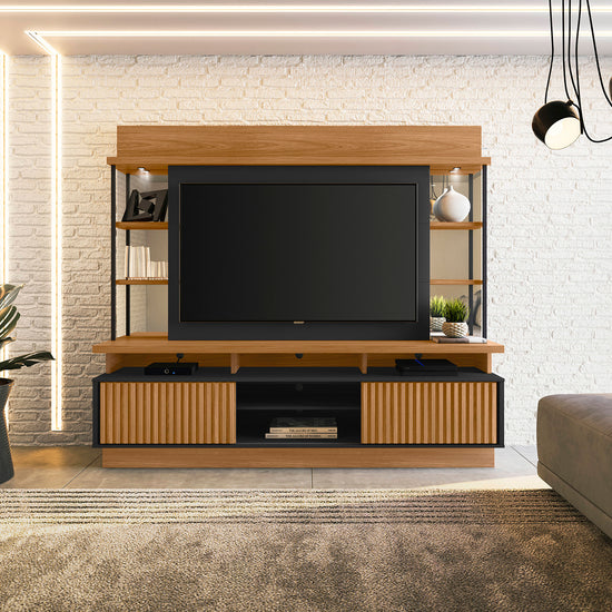 El Centro de Entretenimiento Salvador Natural, Negro es una opción moderna y funcional para tu sala. Con espacio para televisores de hasta 60”, cuenta con dos puertas corredizas que ocultan el almacenamiento, repisas laterales decorativas, espejos y acabados que combinan madera natural y negro para un estilo contemporáneo y elegante.