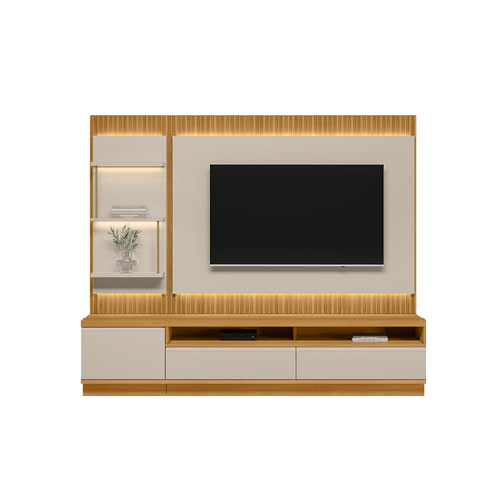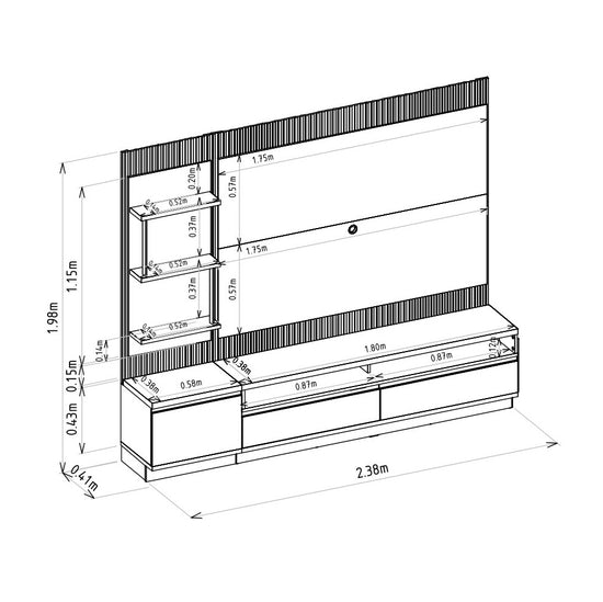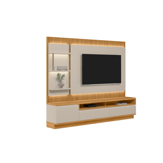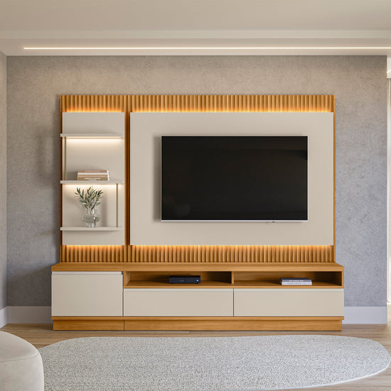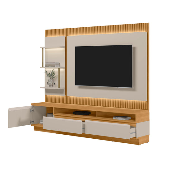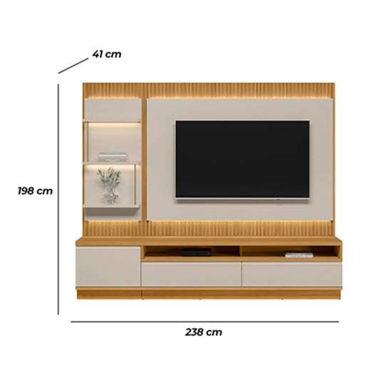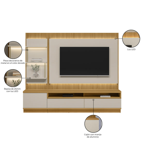 *Espacio Tv hasta 70" atributos: Panel con LED Repisa con LED en la lateral Pieza decorativa de metal dorada Hasta 70" en el panel 175 x 114 Hasta 70" en la base 180 x 38