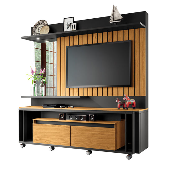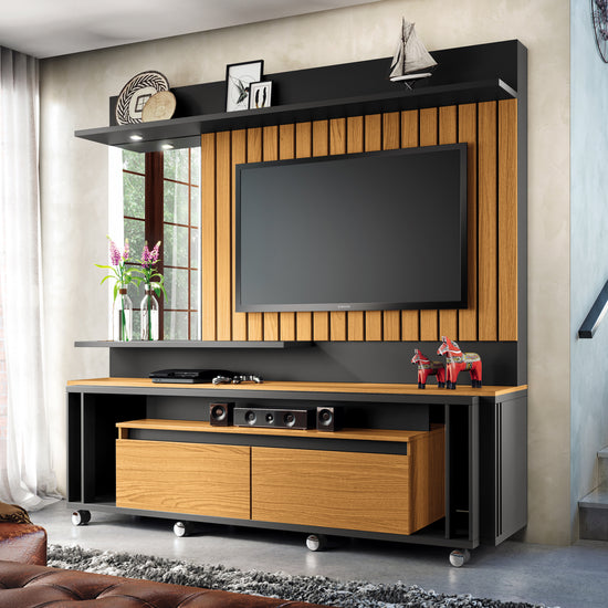 Centro de Entretenimiento elaborado en madera industrializada de pino (MDF/MDP), con una pintura UV que garantiza su durabilidad y resistencia. Su diseño añade un toque contemporáneo y atractivo, convirtiéndolo en un punto central destacado en tu sala de estar. Cuenta con dos gavetas con rieles extensibles para un almacenamiento conveniente, y un elegante espejo lateral que agrega un toque de estilo. Además, está equipado con luces LED para crear un ambiente acogedor, rodachines para facilitar su movimiento y espacio para televisores de hasta 60 pulgadas. Incluye un soporte de TV para una instalación rápida y sencilla. Transforma tu espacio de entretenimiento con este centro versátil y funcional. Transporte y armado gratis.
