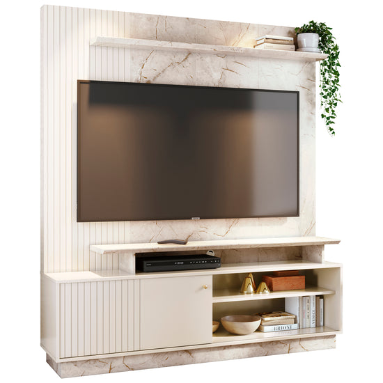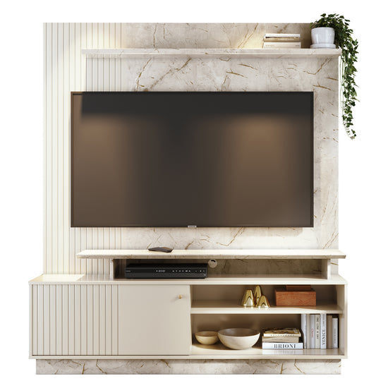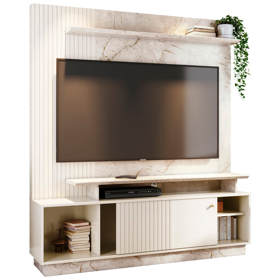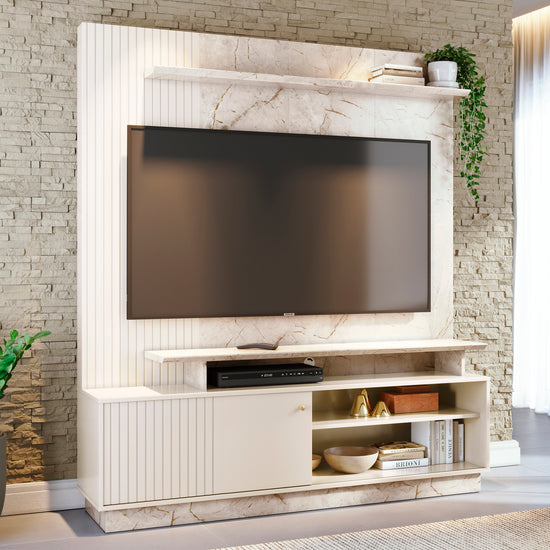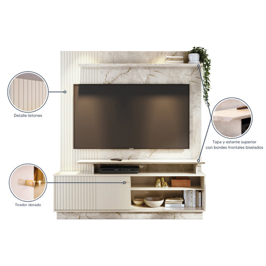 El Centro de Entretenimiento Astro Mármolado, elaborado en madera industrializada de pino, presenta un diseño elegante y funcional. Con puerta corredera y detalles de listones en el panel y la puerta, este mueble también incluye una manija plástica dorada, su tapa y repisa superior tienen un borde biselado. Con espacio para TV de hasta 65", es la elección perfecta para modernizar tu sala.