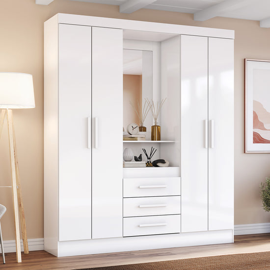 Closet elaborado en Madera Industrializada de Pino con pintura UV, diseño inteligente y versátil. Cuenta con 4 puertas abatibles que facilitan el acceso a tus pertenencias, 3 gavetas que te brindan un espacio adicional para organizar y ocultar elementos más pequeños, manteniendo la superficie ordenada y libre de desorden, percheros de aluminio de alta resistencia, perfectos para colgar tus prendas favoritas de manera organizada, evitando arrugas y manteniendo tus conjuntos siempre listos para lucir.
