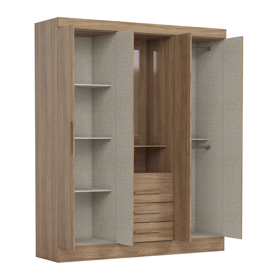 Closet elaborado en Madera Industrializada de Pino con pintura UV, diseño inteligente y versátil. Cuenta con 4 puertas abatibles que facilitan el acceso a tus pertenencias, 3 gavetas que te brindan un espacio adicional para organizar y ocultar elementos más pequeños, manteniendo la superficie ordenada y libre de desorden, percheros de aluminio de alta resistencia, perfectos para colgar tus prendas favoritas de manera organizada, evitando arrugas y manteniendo tus conjuntos siempre listos para lucir.