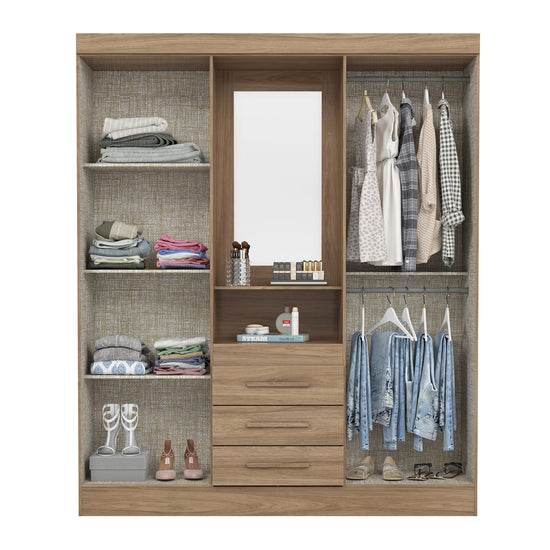 Closet elaborado en Madera Industrializada de Pino con pintura UV, diseño inteligente y versátil. Cuenta con 4 puertas abatibles que facilitan el acceso a tus pertenencias, 3 gavetas que te brindan un espacio adicional para organizar y ocultar elementos más pequeños, manteniendo la superficie ordenada y libre de desorden, percheros de aluminio de alta resistencia, perfectos para colgar tus prendas favoritas de manera organizada, evitando arrugas y manteniendo tus conjuntos siempre listos para lucir.