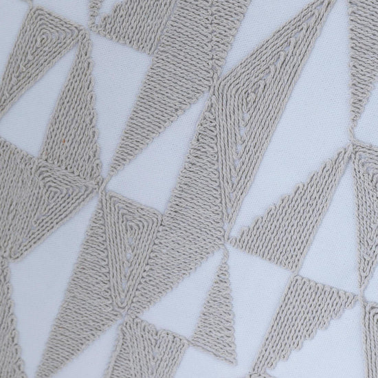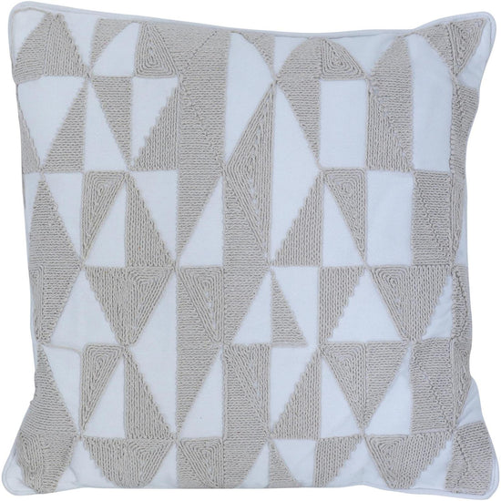 Cojin con diseño elegante con un patrón de triángulos en dos tonos diferentes: blanco y beige. Los triángulos beige tienen una apariencia texturizada y tejida, mientras que las áreas blancas son suaves. Esta combinación de texturas y colores crea un efecto visual interesante que hace que el cojín destaque como un elemento decorativo. Listo para usar.
