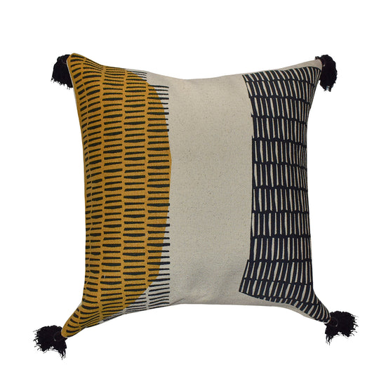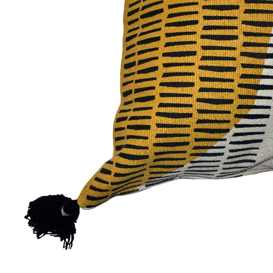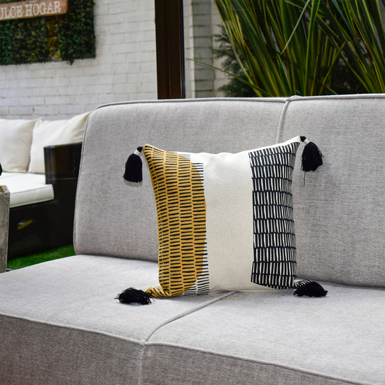 Cojín decorativo con patrones de bordado en tonos mostaza y negro, que contrasta elegantemente con el fondo beige. Las borlas en las esquinas añaden un toque sofisticado, convirtiendo este cojín en una pieza destacada que aporta estilo y comidad a cualquier espacio, listo para su uso.