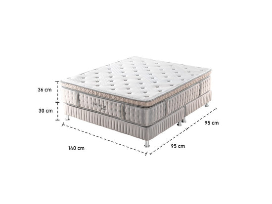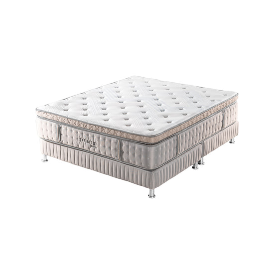 Colchón Euro Top + somier divido en sofisticada tela jacquard beige con patas de acero, más 2 almohadas siliconadas. El Euro Top ofrece una capa extra de acolchado que brinda mayor confort y adaptabilidad, combinando firmeza y suavidad para transformar tus noches. Descansa, renueva y despierta en grande.