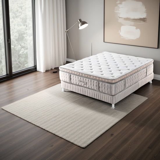 Colchón Euro Top + somier en sofisticada tela jacquard gris con patas de acero, más 2 almohadas siliconadas. El Euro Top ofrece una capa extra de acolchado que brinda mayor confort y adaptabilidad, combinando firmeza y suavidad para transformar tus noches. Descansa, renueva y despierta en grande.