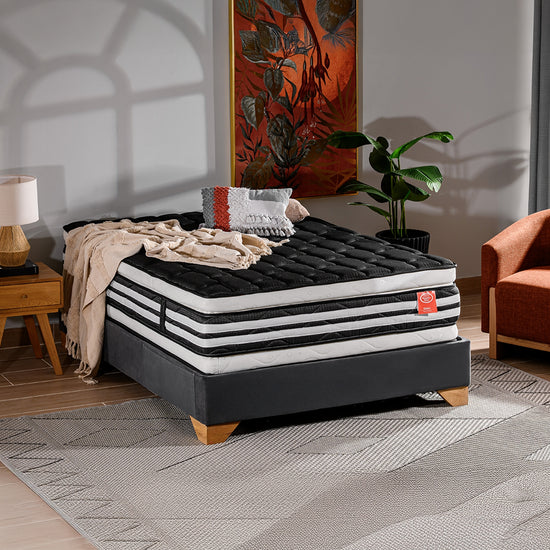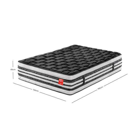 El Colchón Ónix Plus está diseñado con capas de espuma Ergofoam que aseguran la correcta postura de la espalda, distribuye el peso del cuerpo de forma uniforme, mejorando la calidad del sueño. Su diseño brinda una combinación ideal de confort y soporte, mientras que su altura de 40 cm le aporta presencia y elegancia. Cuenta con una firmeza media, perfecta para quienes buscan equilibrio entre suavidad y estabilidad.